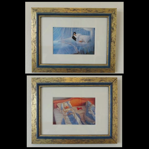 Myydään kullanvärisillä kehyksillä ja lasilla kaksi Kaj Stenvallin Ankka-teosta.