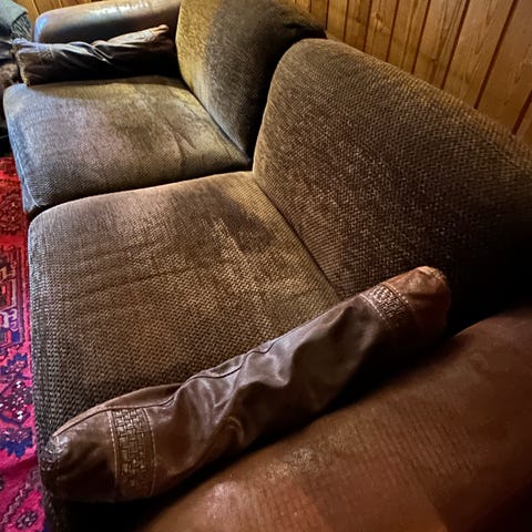 Annetaan Iskun valmistama laadukas mutta jo aikaa nähnyt kolmen hengen kangassohva. Hyvä istua ja ryhdikäs, jouset kunnossa.