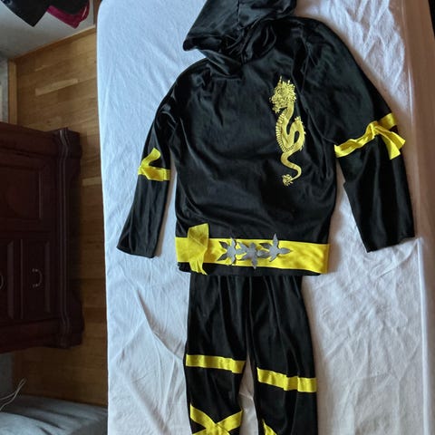Myydään lasten naamiaisasu: paita, housut, vyö ja lakki. Koko 140. Hp 15e.