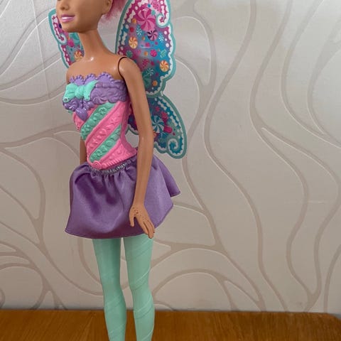 Barbie-nukke, jolla on siniset pitkät hiukset ja värikäs sateenkaarikuvioinen hame. Nukella on pinkki yläosa, vaaleanpunaiset sukkahousut ja pinkit kengät. Ehkä Dreamtopia-sarjaa.