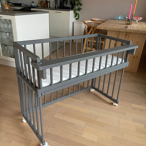 Sängystä puuttuu kiinnitysremmit millä saa vanhempien sänkyyn kiinni. Meillä pysynyt hyvin pelkillä jarruilla.