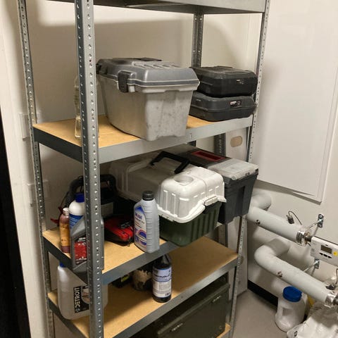 Varastohyllyjä 2kpl 150cm korkeita metalli hyllyillä ja 1kpl kulmahylly purettu noin 180cm korkea, hyllyt MDF-levyä