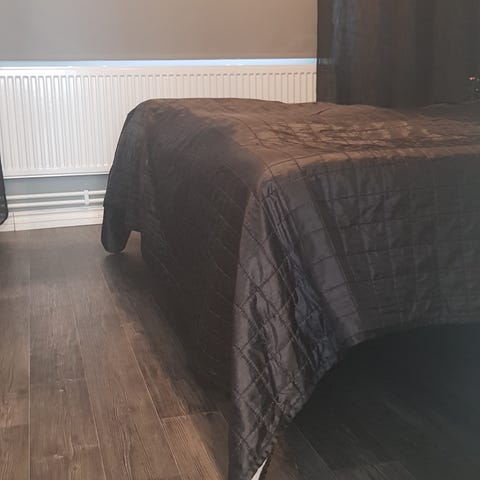 Hyväkuntoinen harmaa ”samettipintainen” päiväpeitto. Ei muistikuvia mistä ostettu, ehkäpä JYSK?