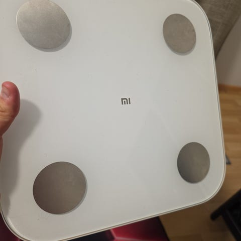 Xiaomi Mi Body Composition Scale 2 henkilövaaka. Väri valkoinen. Lasinen yläpinta ja neljä metallista anturialuetta.