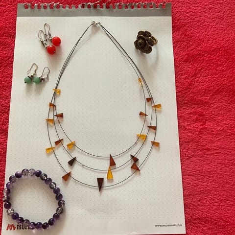 Korurasia, jossa meripihkakoruja ja ehkä jokunen muukin koru.