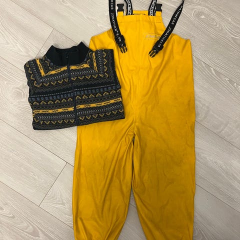 Housuissa on säädettävät henkselit, lahkeissa kuminauhat. Edessä kalakuvio ja takana heijastinyksityiskohtia.