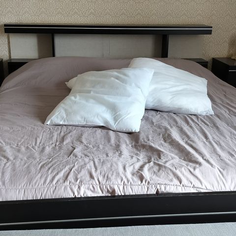 Parisänky 60 - 70-luvun vaihteesta. Sängyn runko valkoinen. Molemmin puolin laatikostot päätyhyllyn päädyssä ja keskellä yövalo. Laatikoiden välissä musta tekonahka verhoilu ja myöskin jalkapäädyssä.