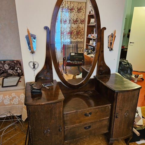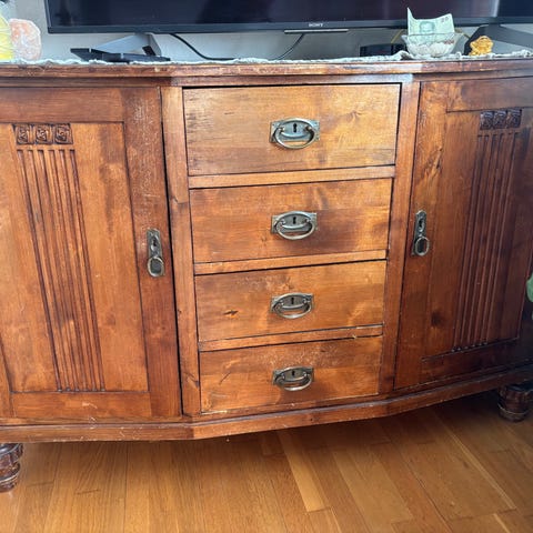 Puinen senkki, joka on maalattu keltaiseksi. Etuosassa on kaksi laatikkoa ylhäällä ja kaksi ovellista kaappia alhaalla. Takareunassa ja sivuilla on korotettu reunus, joka estää tavaroita putoamasta. Maalipinnassa on kulumaa ja patinaa, mikä antaa kalusteelle käytetyn ilmeen.