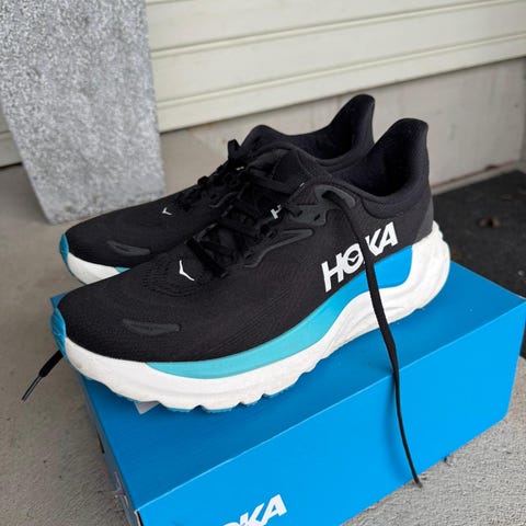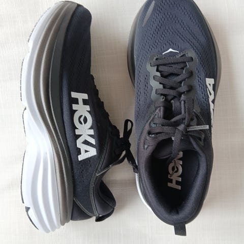 Hoka juoksukengät, koko 42. Vaaleansävyiset mallit, yhdessä parissa harmahtava ja toisessa sinivihreä–liila väritys. Paksu vaimennettu välipohja ja verkkomainen päällinen. Sopivat juoksuun ja muuhun liikuntaan. Unisex-malli.