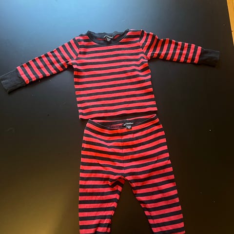 Myyntiin pieneksi jäänyt ihana Marimekon lasten pyjama (Väsy 1). Unisex-mallinen kaksiosainen yöpuku, jossa pitkähihainen paita ja pitkälahkeiset housut. Materiaalina ruskea-oranssi-raidallinen puuvillatrikoo. Sopii käytettäväksi yöasuna tai kotiasuna lapselle, jonka pituus on noin 86 cm.