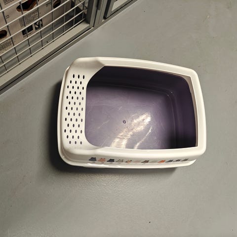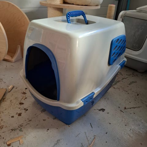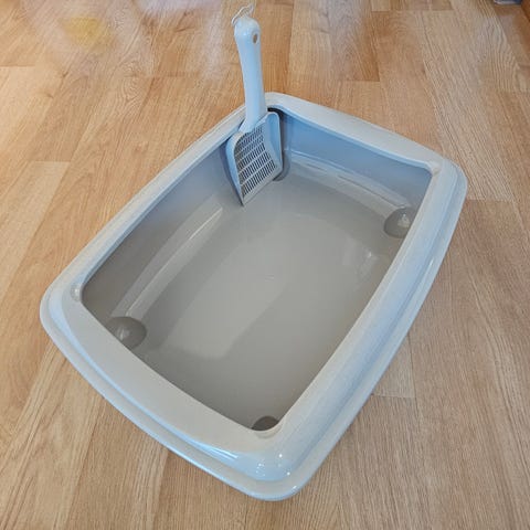 Myydäön tarpeettomaksi jäänyt kissan laatikko. Mukaan tulee kuvassa näkyvä lapio
