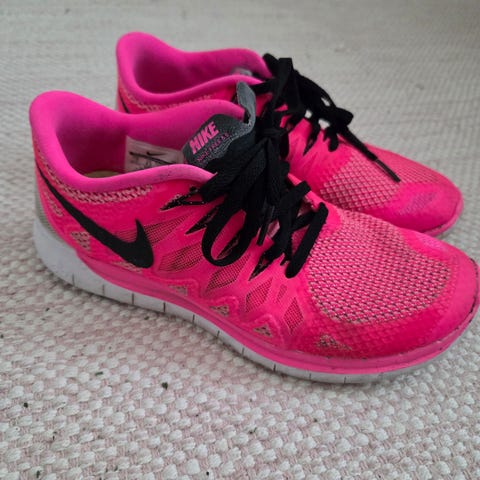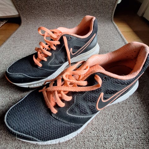 Nike juoksukengät, koko 38. Violetti päällinen, vaaleanpunaisia yksityiskohtia ja valkoinen Nike-logo sivuilla. Nauhakiinnitys ja hengittävä verkkomainen päällismateriaali. Pohjassa monivärinen kumipohja, jossa kuvioitu pinta juoksuun ja muuhun liikuntaan. Sopivat juoksuun ja yleiseen harjoitteluun.