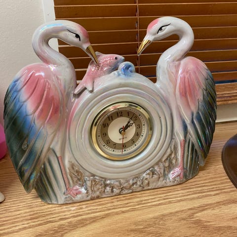 Taidokas lasityökello, jossa kaksi kurkea. Halkaisija 27 cm.
