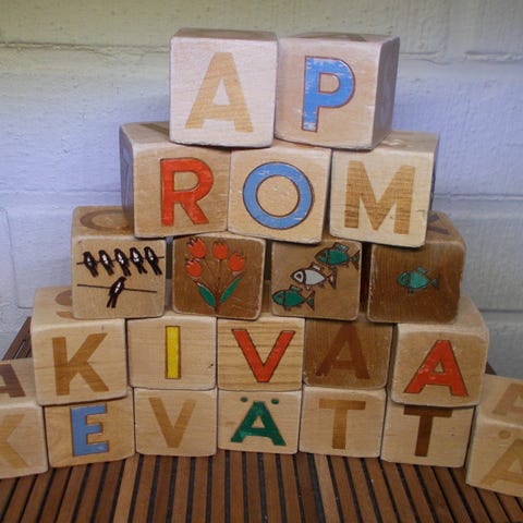 4 retrokankaista vaahtomuovi palikkaa. Paljon leikitty,mutta ehjät ja kirkkaat värit kankaissa.