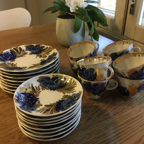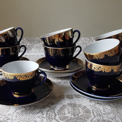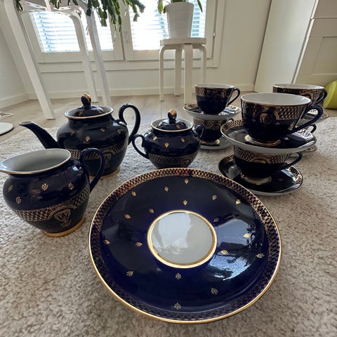 Hyväkuntoinen, jonkun verran käytönjälkiä omaava Lomonosov Golden Frieze kahviastiasto, 4 kuppia ja niiden aluslautaset, vain pienet. koboltinsininen, kullattu.