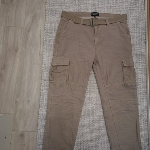 Miesten L kokoiset reisitaskuhousut. Lahkeissa resorit. Kissa- ja entinen koiratalous