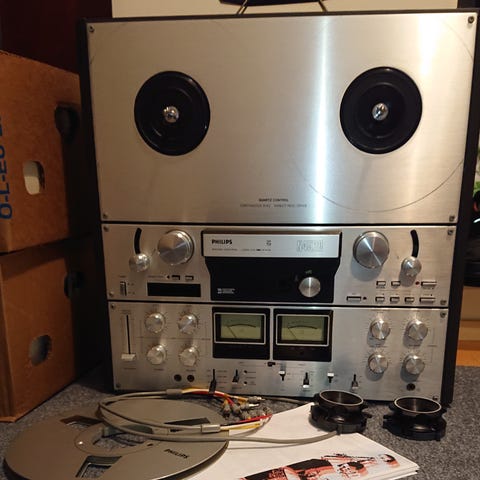 Neliraitainen ja putkivahvistimella varustettu kelanauhuri Tandberg 74b. Mukaan putkia toisesta yksilöstä.
