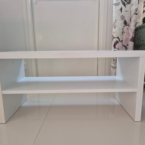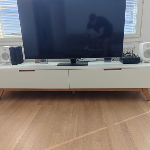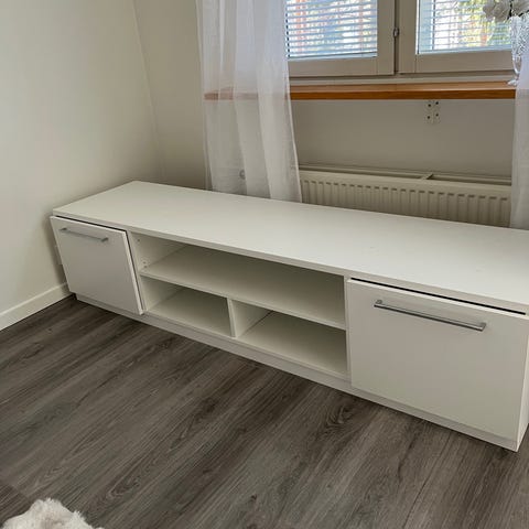 Tv-taso valkoinen. Tv-tasossa on kaksi umpiovea ja avohyllyt keskellä laitteille tai muille tarvikkeille. Väri on valkoinen, pinta on sileä ja helppo pitää puhtaana. Soveltuu olohuoneeseen tai muuhun tilaan televisiolle ja mediavälineille.