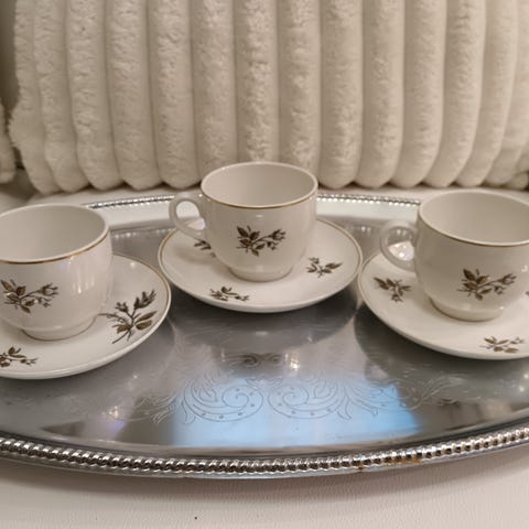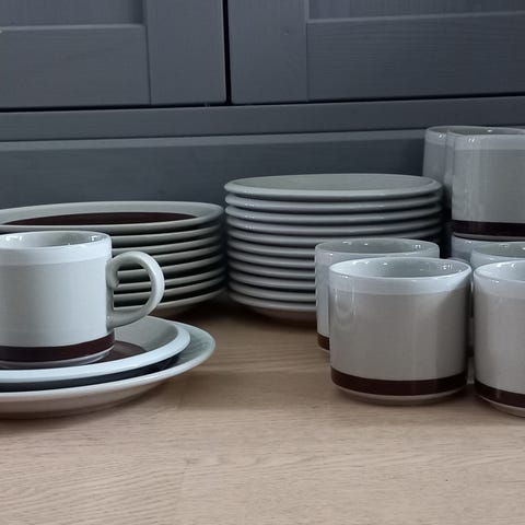 Arabian Raitahopea -sarjan astiat 1930-luvulta: 4 x kahvikuppi, 9 x tassi (+ 3 x aluslautanen ja 1 x iso lautanen). Design Greta-Lisa Jäderholm-Snellman. Kuppien korkeus 5,2cm, halkaisija 8cm ja vetoisuus 15cl. Tassien ∅13,5cm, aluslautasten ∅17,5cm ja ison lautasen ∅25,2cm. Piippuleimat pohjassa. Kupit ja tassit hyvässä käytetyssä kunnossa, isommissa lautasissa enemmän käytön jälkiä (yhdessä aluslautasessa ja isossa lautasessa palanen reunasta rikki, ks kuvat).