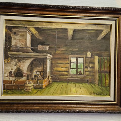 K. Pylkkösen signeeraama öljyvärimaalaus vuodelta 1989. Aiheena maalaistalomaisema, jossa etualalla vanha puinen rakennus ja taustalla peltoja sekä toinen rakennus. Teos on suorakaiteen muotoinen ja kiinnitetty moniosaisiin puukehyksiin, joissa on sisäkkäiset listat eri sävyissä. Maalaus on valmis ripustettavaksi sisätiloihin, esimerkiksi olohuoneeseen tai työtilaan seinäkoristeeksi.