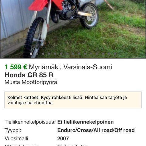 Tästä honda cr osia myynnissä hinnasta voi tulla sopimaan yv mm keihin kaasutin, hyvässä kunnossa ja vanteet, tanko, iskarit, katteita, swingi. Jos on mottia myydä, saa tulla ehdottelemaan hintaa ja hieromaan kauppoja.