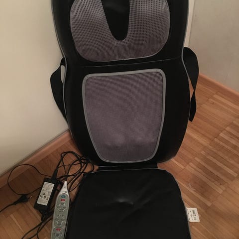Casada hierontalaite. Sähkökäyttöinen laite, jossa on kahvat sivuilla ja pehmustettu harmaa hierontaosa. Sopii lähinnä niskan hierontaan ja rentouttavaan käyttöön kotona. Laite kytketään verkkovirtaan johdon avulla ja sitä ohjataan erillisellä säätimellä (näkyy kuvassa). Toinen on lihashierontalaite. Molemmat yhteensä 13€. Molemmat toimivat.