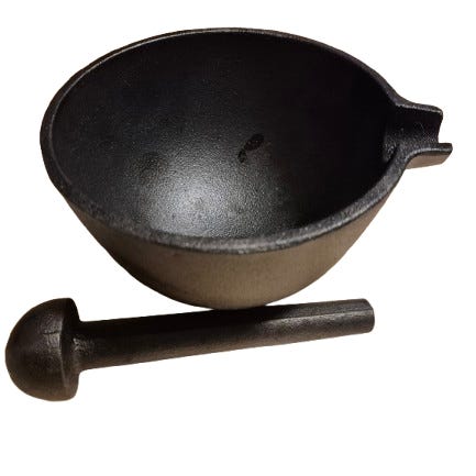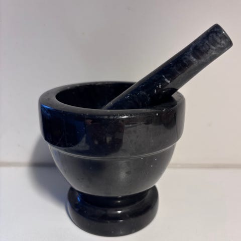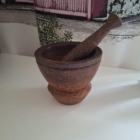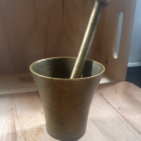 Myydään kuvanmukainen mortteli, neljä survinta sekä puuteline.