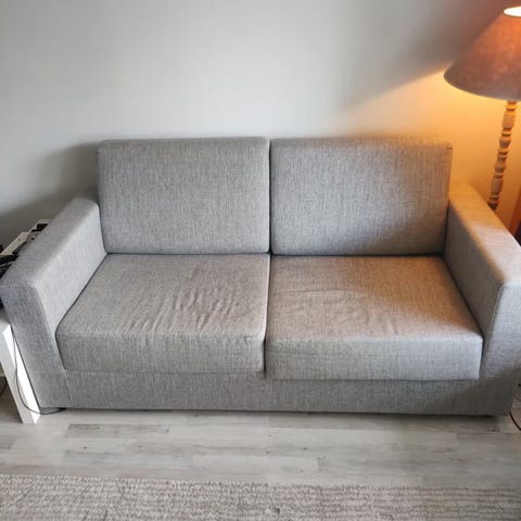 Vuodesohva, kangas istuimesta vähän revennyt, saa korjattua varmasti jos osaa, sohvan alta mennyt puu osio rikki josta on kuva mutta se ei vaikuta divaanin käyttöön. Edellisessä muutossa ottanut vähän osumaa, toisessa käsinojassa myös pieni kangas repeämä, saa kahteen osaan. Vetoköysi on katkennut mutta senkin varmasti saa korjattua jos osaa