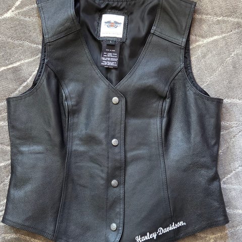 Harley-Davidson musta nahkaliivi naisille. Koko M. Edessä ja takana koristepainatuksia ja niiteillä koristeltu pääkallokuvio. Liivissä on vetoketjukiinnitys edessä sekä sisäpuolella vetoketjullinen tasku. Sivuilla nyöritys istuvuuden säätöä varten. Tosi hyvässä kunnossa.