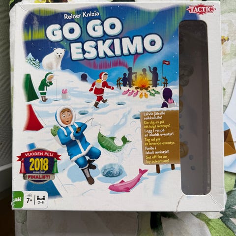 Tactic Go Go Eskimo lautapeli. Perhepeli, jossa pelaajat liikkuvat jäälautalta toiselle ja keräävät kaloja reitiltä. Peli sisältää pelilaudan, pelihahmot, erilaisia pelimerkkejä ja kortteja. Suositusikä 7+ vuotta, 2–6 pelaajaa. Vuoden Peli 2018 perhepelit -sarjan finalisti. Hyvässä kunnossa. Hinta 5 euroa.