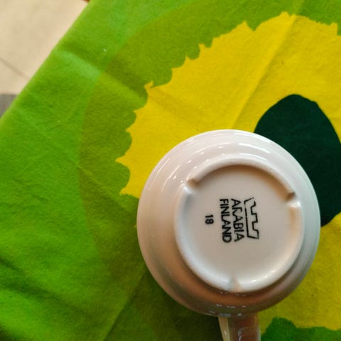 Arabia Forte. Kuppi halkaisija 7.5cm, korkeus 6cm, lautanen halkaisija 13cm.
