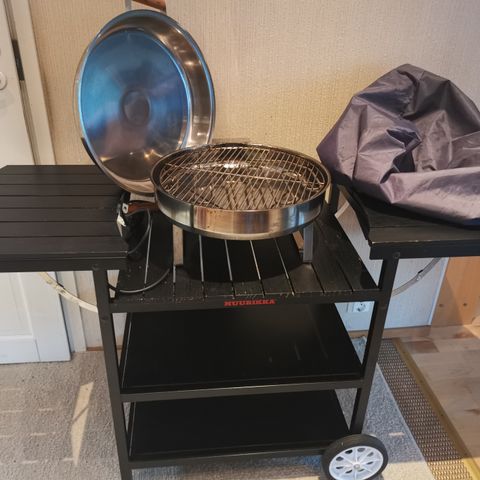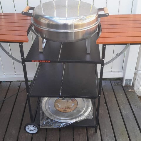 Muurikka sähkökäyttöinen kesäkeittiö ulkokäyttöön. Puuosista maali hiukan lohkeillut, mutta muuten erittäin hyväkuntoinen ja säännöllisesti huollettu. Mukana on suojapeite, jossa Muurikka-teksti. Soveltuu ruoanvalmistukseen terassilla tai pihalla.