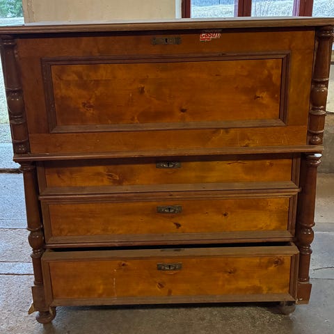 Puinen senkki, jossa on kaksi ovikaappia, useita vetolaatikoita sekä keskellä avautuva laskutaso tai kirjoitustaso. Pinta on ootrattu. Materiaali koivua, todennäköisesti Rauman seudulta, vanhaa käsityötä.