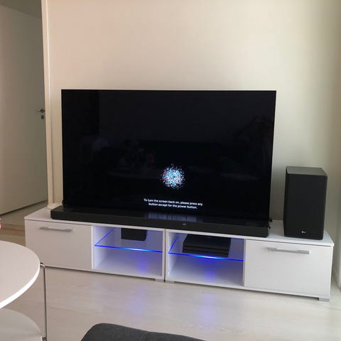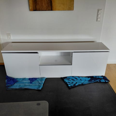 Valkoinen tv-taso, jossa kaksi etupuolelta avautuvaa laatikkoa. Laatikoiden sisällä "kaksitasoinen" hyllyasetelma ja nämä aukeavat sekä sulkeutuvat kevyellä painalluksella etupuolelta. Tv-tason päällä oleva pinta lasilevyä, jota helppo pitää puhtaana.