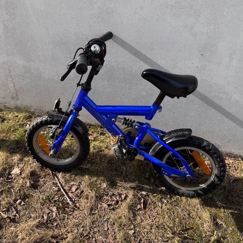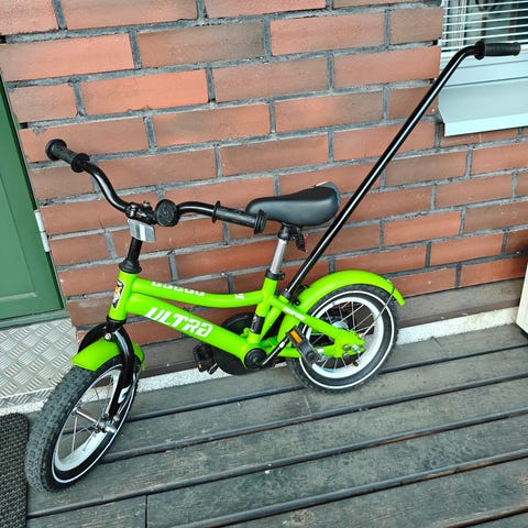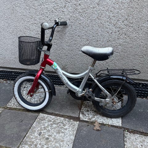 Nopsa lasten polkupyörä 12". Mukana irrotettavat apupyörät ja kuvista unohtunut työntöaisa. Kunto hyvä, mutta pientä naarmua rungossa ja satulasta lähtenyt vähän väriä. Renkaat, jarrut ja säädöt toimii hyvin. Kello ei valitettavasti toimi. Säilytetty aina sisällä.
