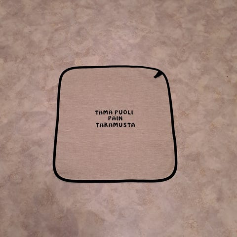 Uusi pellavasta ommeltu laudeliina/pefletti n.45x45cm, käsinpainettu VAARI teksti.