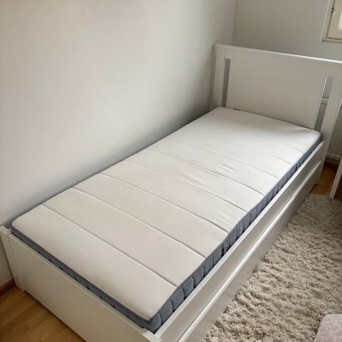 Ikea NORDLI Sängynrunko säilytystilalla, valkoinen, 90x200x30 cm. Uudenveroinen, säilytetty puhtaassa, savuttomassa ja lemmikkivapaassa kodissa. Hintaan sisältyy vain sängynrunko. Jos olet kiinnostunut myös patjasta, voimme neuvotella - patja on ÅNNELAND Hybrid - patja, kova/valkoinen, 200x90 cm, myös erinomaisessa kunnossa.