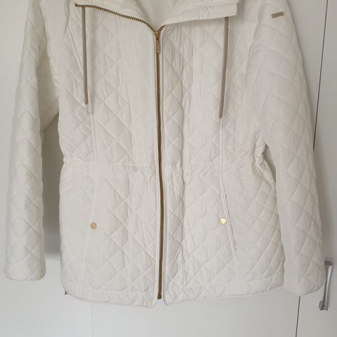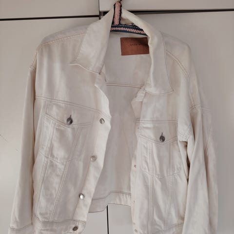 Valkoinen takki puuvillaa. Merkki Review. Koko 38. Vesipesu 40 asteessa. Takana halkio.