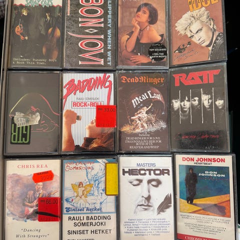 Myynnissä kasettikokoelma, johon kuuluu useita rock- ja rock’n’roll-artistien kasetteja. Kuvassa näkyvät ainakin seuraavat kasetit: Del Shannon – Greatest Hits, Stray Cats – Choo Choo Hot Fish, Eddie Cochran – On The Air, Shakin’ Stevens – Rock’n’Roll sekä Gene Vincent – Lonesome Fugitive. Kokoelma sisältää useiden eri artistien albumeita yhdellä kertaa. Sopii esimerkiksi kasettisoittimeen ja musiikin kuunteluun fyysiseltä äänitteeltä. Kunto ja tarkka kasettien määrä kannattaa varmistaa myyjältä.
