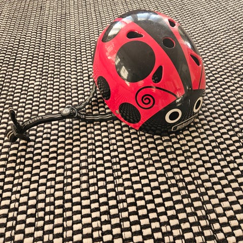 Hyvässä kunnossa oleva lasten pyöräilykypärä. Kypärässä on säädettävä kiristysrulla takana sekä leukahihna pikalukolla.