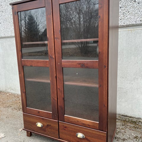 Hieno vitriinikaappi, ruskeaa puuta ja lasiovet. Kaapissa on useita hyllyjä tavaroiden säilytykseen ja esillepanoon sekä alhaalla laatikoita pientavaroille. Soveltuu esimerkiksi astioiden, koriste-esineiden tai kirjojen säilyttämiseen olohuoneessa, ruokailutilassa tai muussa sisätilassa. Kaappi noudettavissa porvoossa.