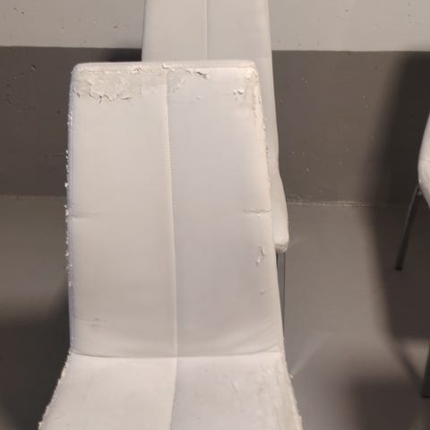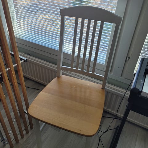 Viisi wieniläistyyppisiä tuolia 1970-luvun puolestavälistä. Kunto kohtuullisen hyvä/ hyvä. Olleet kahvipöydän kumppaneina eli eivät päivittäisessä käytössä. Tuolit ovat rakenteeltaan keveitä. Kahdessa tuolissa istuinosien takaosassa kuvien mukaisia tahroja ja yhden tuolin istuinosa hieman reunasta noussut. Istuinkankaat kuitenkin ehjät eikä tuolien puisissa rakenteissa ole kolhuja. Yhden tuolin hinta 2 €. Nouto Nättinummesta.