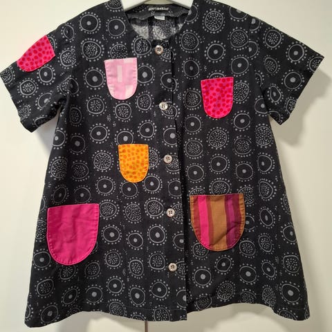 Marimekko lasten mekko tytöille, koko 100 cm. Mekko on valmistettu puuvillasta ja siinä on tumma, kuviollinen pohjakangas sekä moniväriset paikkataskut edessä ja takana. Lyhyet hihat ja edessä napitus helpottavat pukemista. Sopii arkeen ja juhlaan lapsen vaatekaappiin. Erittäin hyvässä kunnossa. Marimekon vanhempaa tuotantoa.