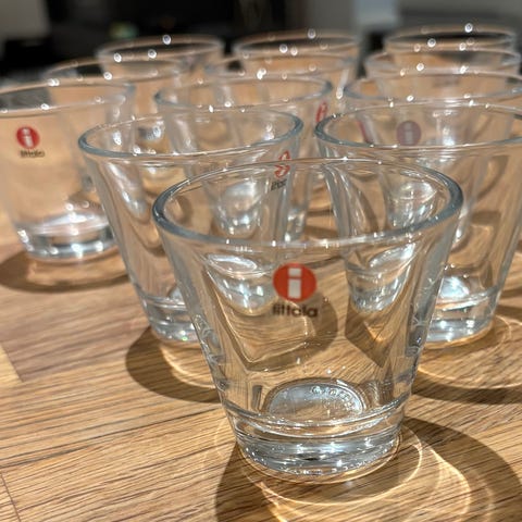 Iittalan Kartio juomalasit 2dl 6 kpl pakkaus sekä kirkkaita että tumman harmaita.