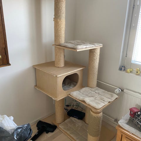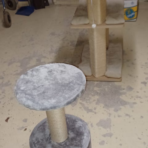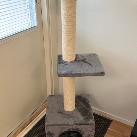 Kissan raapimapuu vaaleilla pehmusteilla. Pehmusteet saa irti ja voi pestä koneessa (nyt ei ole pesty). Ylätasolla nukkumapeti. Yleisesti ottaen siistissä ja käyttökelpoisessa kunnossa seuraavalle käyttäjälle, mutta käytönjälkiä ja kissankarvaa löytyy jonkin verran. Korkein kohta noin 90 cm, leveys noin 60 cm. Ollut sisäkäytössä, nyt vain poikkeuksellisesti ollut lasitetulla parvekkeella pari viikkoa.