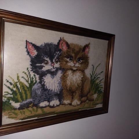 Kehystetty kissapiirros sinisellä passepartout’lla