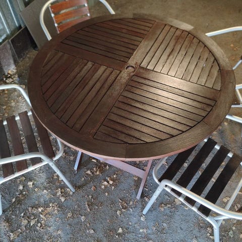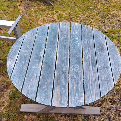 Pöydän pinta vaatii käsittelyä ja pieni halkeama joka vaatii korjausta( kuva). Tuolien pehmusteet myös mahdollista ostaa mukaan (+10€)