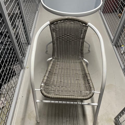 Parvekekalustesetti, johon kuuluu pyöreä puinen pöytä ja kaksi tuolia. Pöydässä on pyöreä, laudoista koottu puinen kansi ja metallijalat. Tuoleissa on metallirunko, verkkokankainen istuin ja selkänoja sekä puiset käsinojat. Pöydän leveys : 70cm ja korkeus 75cm. Tuolin istuinkorkeus: 42cm, istuin syvyys n.44cm ja korkeus 93cm.