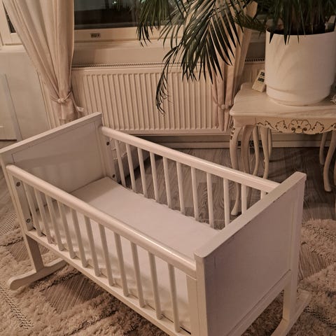 Sänky, jossa on kangasverhoilu sekä yläpuolelta laskeutuva kangasverho. Liikuteltavissa. Soveltuu vastasyntyneelle ja pienelle vauvalle nukkumis- ja lepohetkiin sisäkäytössä. Mukaan patja, peitto, lakanoita.