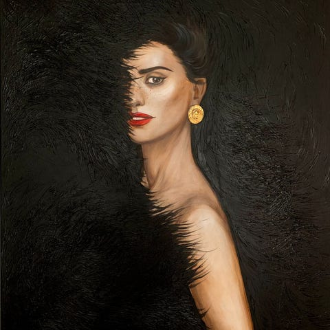 Tyylikäs ja tunnelmallinen öljymaalaus, jossa yhdistyvät naisen muotokuva ja voimakas symboliikka. Teoksessa nainen pitää kädessään petolintua, mikä luo vaikuttavan ja hieman mystisen kokonaisuuden.